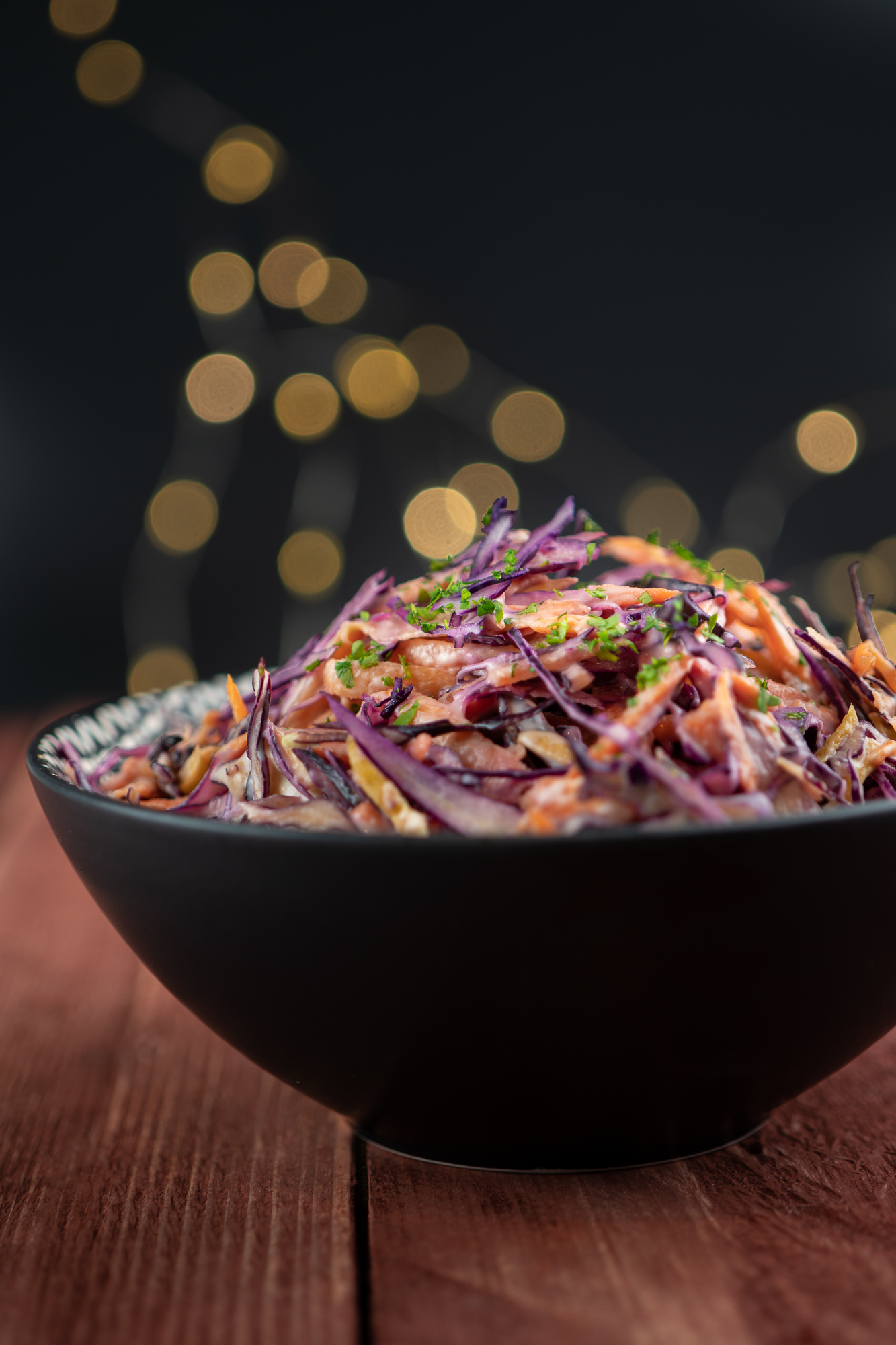 V angleščini se ji reče preprosto coleslaw. Gre za enostavno zeljno solata polnega okusa, ki se vedno prileže. Postrežete jo lahko kot samostojno jed, prilogo ali v veganskem burgerju – tako bo namreč še bolj sočen.