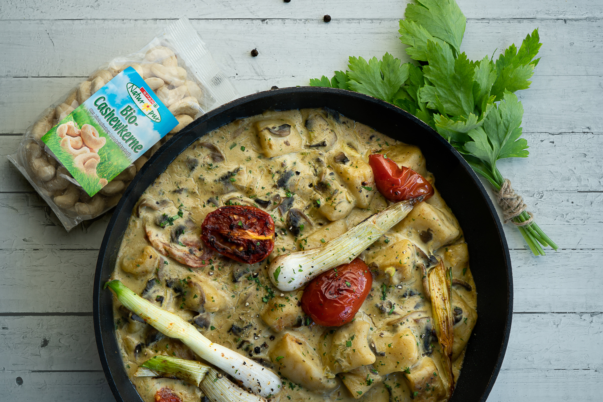 - Njoke prestavimo v pekač ter jih prelijemo z omako iz gob in indijskih oreščkov. Premešamo in posujemo s sesekljanim peteršiljem.