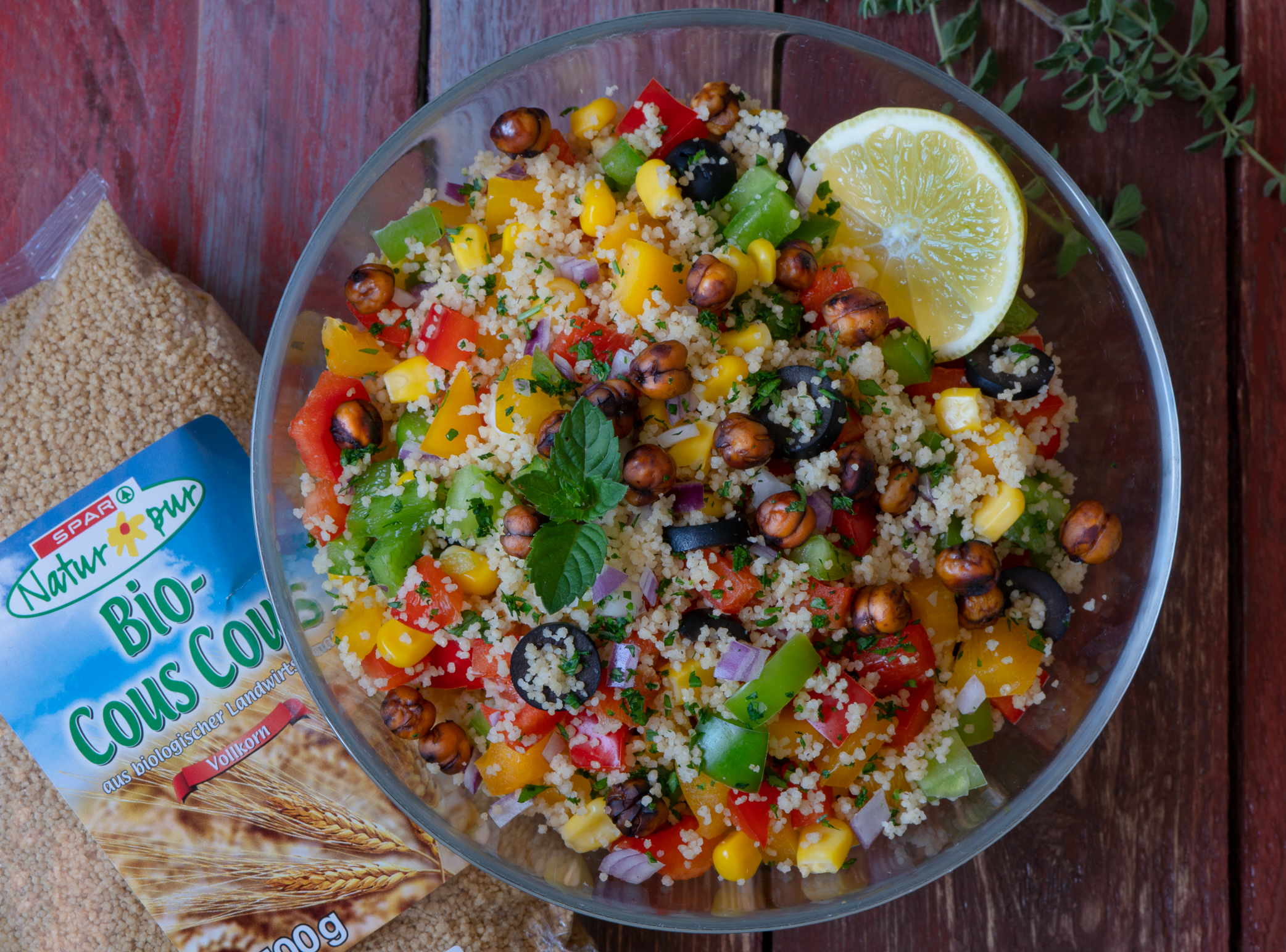 - Zavremo eno manjšo skodelico vode in jo prelijemo čez kuskus SPAR Natur*pur (ki ga vedno pripravljamo v 1:1 razmerju z vodo). Pokrijemo, počakamo nekaj minut in dobro premešamo (za polnejši okus pa lahko dodamo tudi jedilno žlico veganskega masla ali margarine).