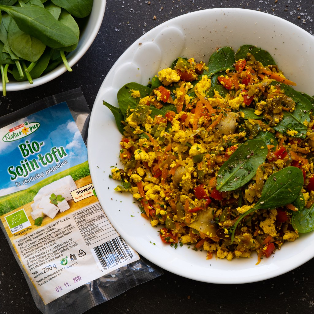 - Tofu operemo, osušimo s paprinato brisačo, ga z rokami nadrobimo in dodamo zelenjavi. Nato jed začinimo s soljo, poprom, dimljeno papriko, čilijem ter kurkumo, ki bo jedi dala prijetno aromo ter rumeno barvo. Čisto na koncu umešamo še 2 pesti sveže špinače.