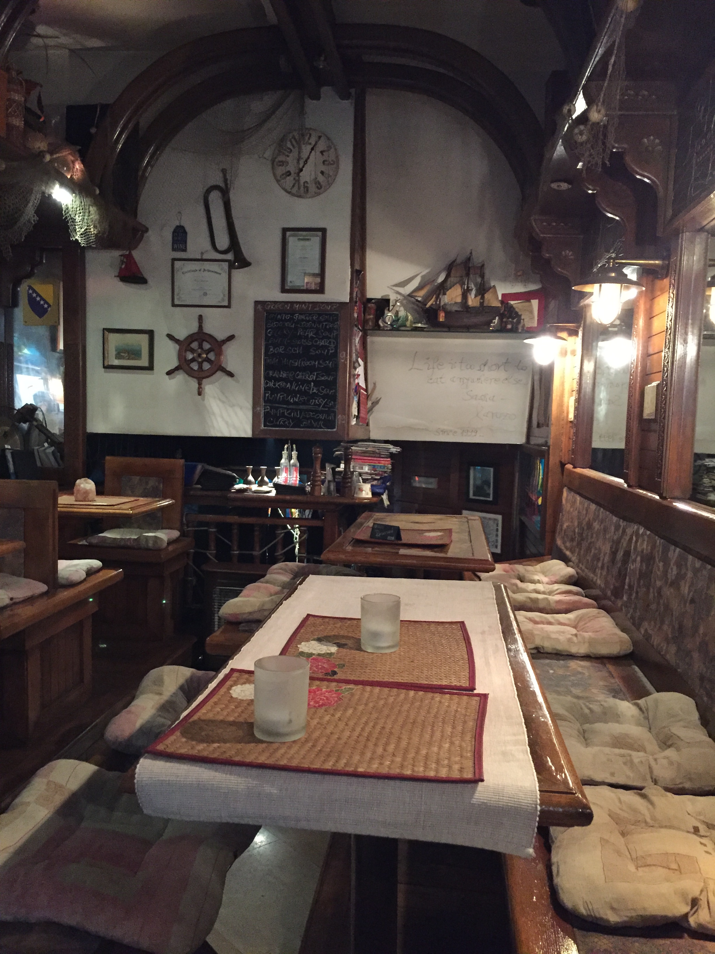 Ko sva vstopila naju je Saša takoj toplo sprejel. Sledila je kratka predstavitev njegove restavracije in menija, ki je v večini vegetarijansko/veganski, postreže pa vam lahko tudi ribe. Restavracijo Karuzo je Saša odprl pred kar pred 17 leti in še sedaj ponosno pove, da se ima za svojevrstnega revolucionarja. Brezmesna restavracija s poudarkom na vegetarijskih in veganskih jedeh v središču Sarajeva se še danes sliši skoraj neverjetno, kako se je šele pred skoraj dvemi desetletji? Pogumno, če že ne revolucionarno!